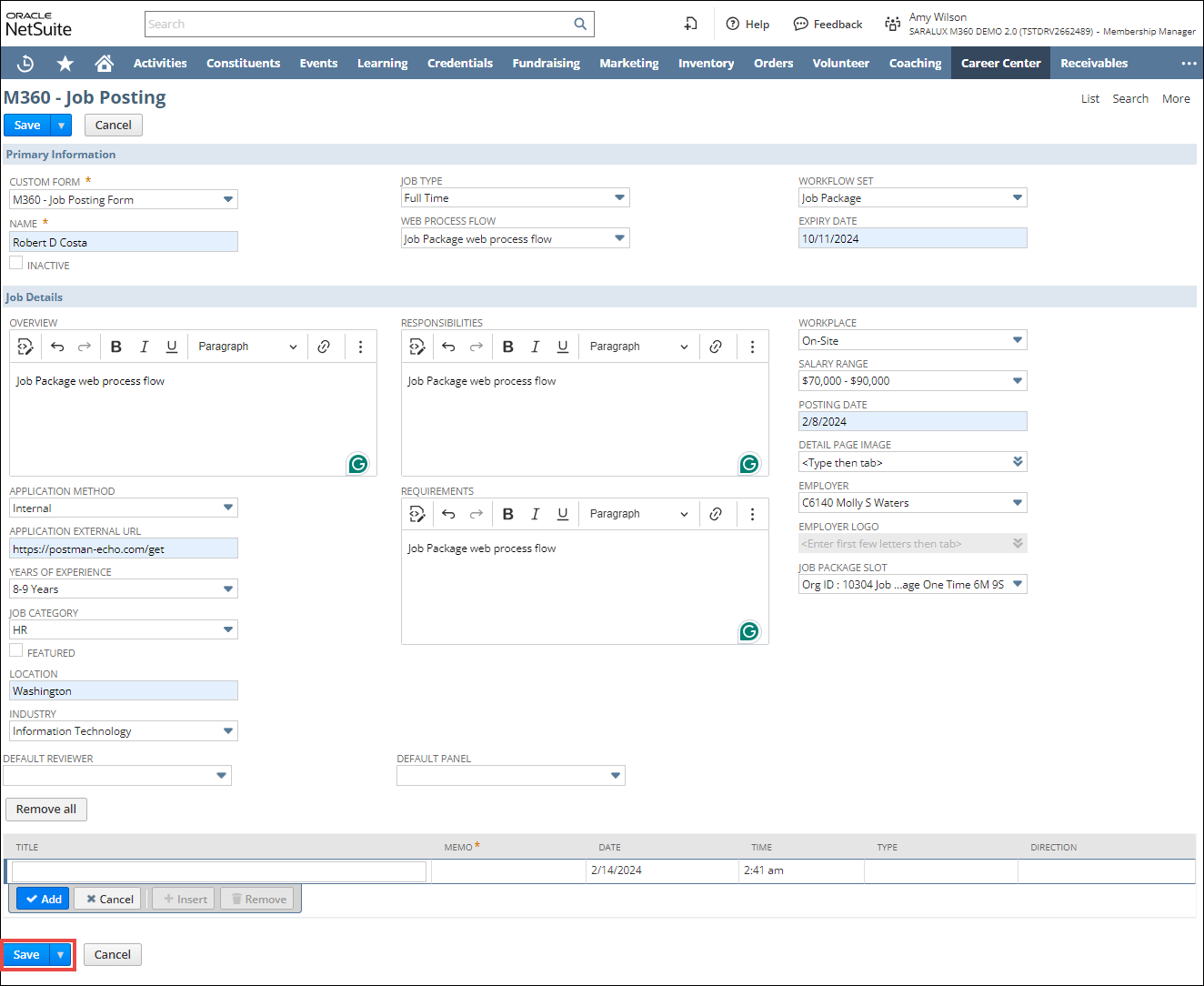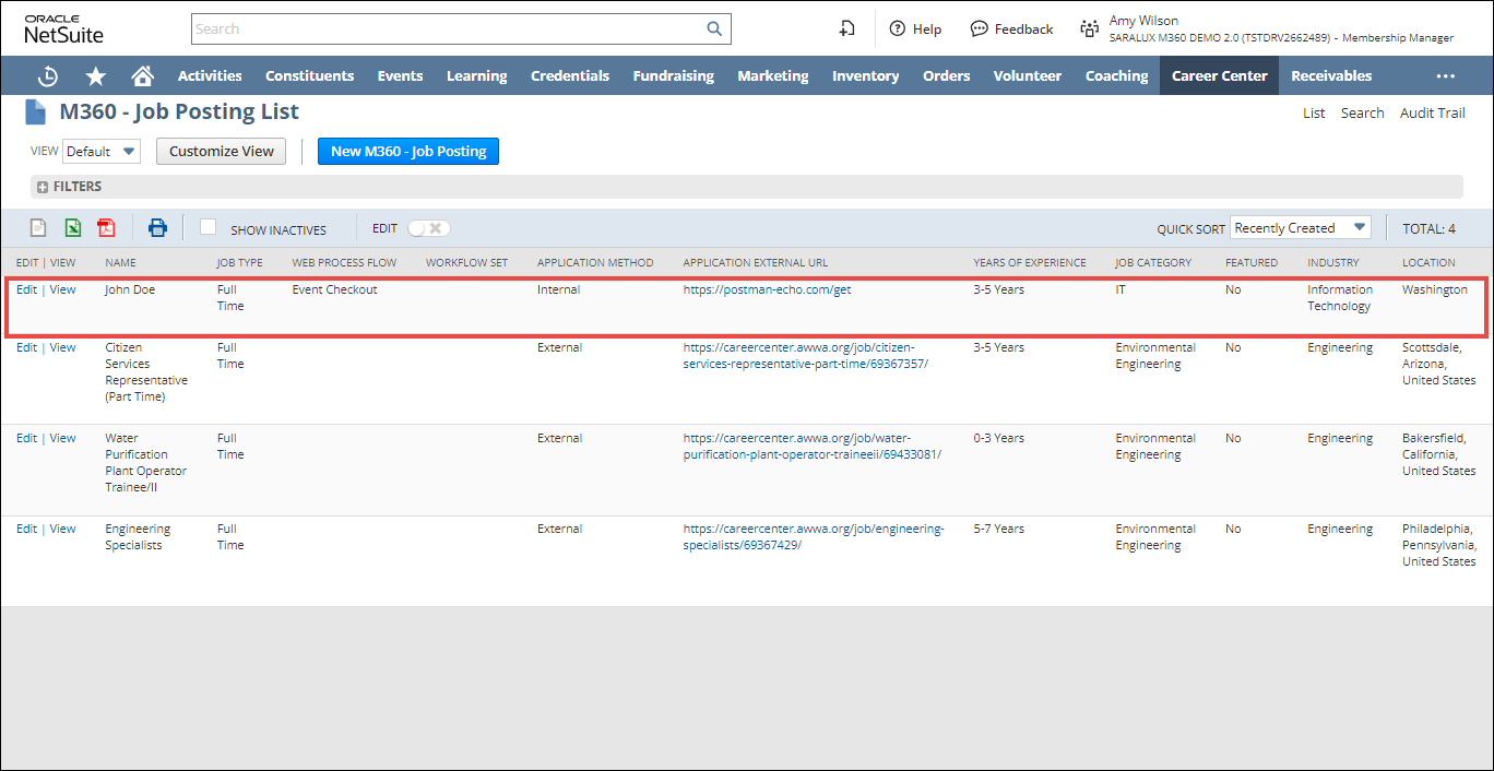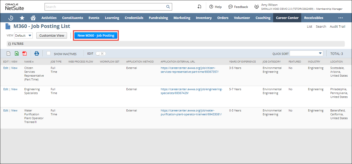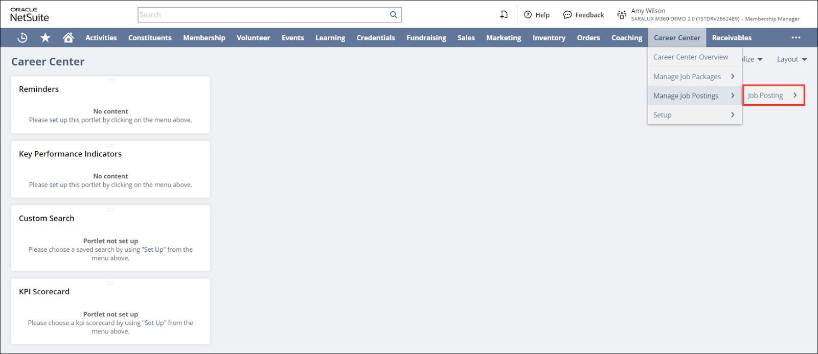 Note: Alternatively, you can create a new job posting by navigating to Career Center > Manage Job Postings > Job Posting and clicking New.
