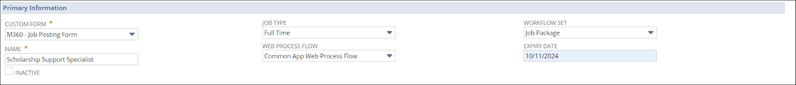 The Primary Information section within the Job Posting form gathers essential data for creating a job posting in the associated fields.