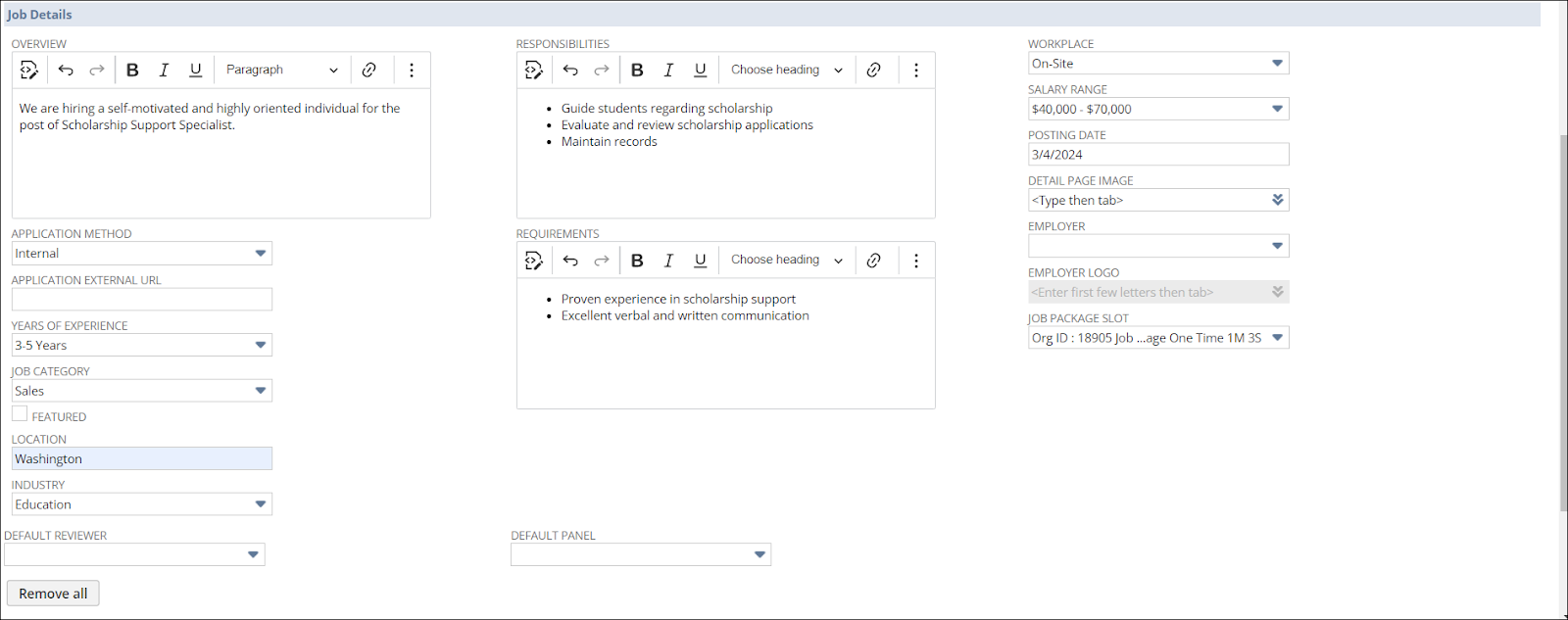 In the Job Details section within the Job Posting form, you can specify the essential data required for fulfillment by the potential candidate.