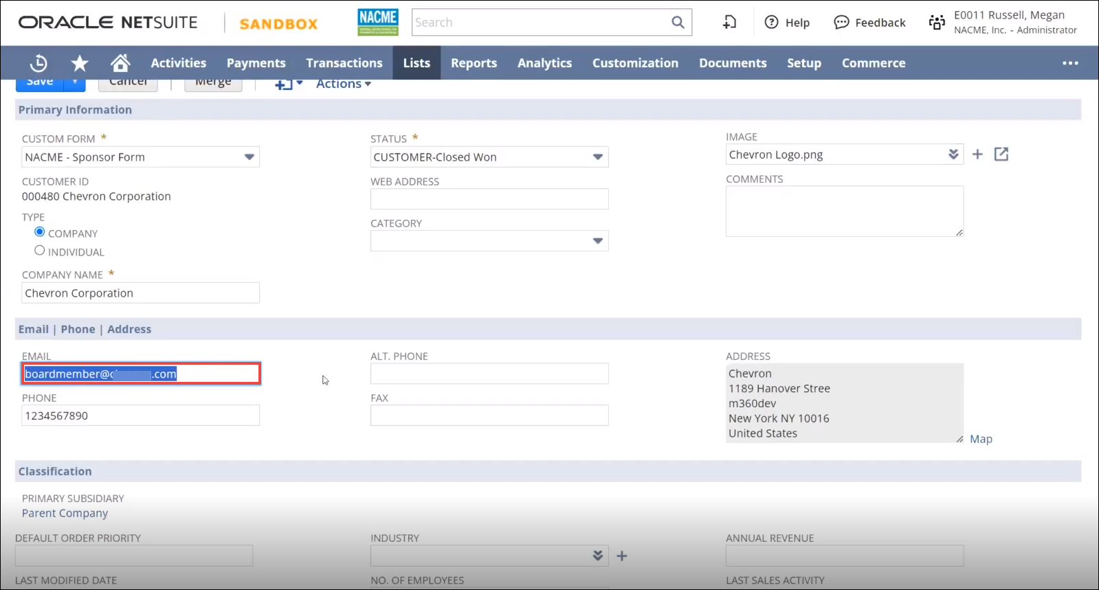Configure the customer email address in the Customer form > Email/Phone/Address.