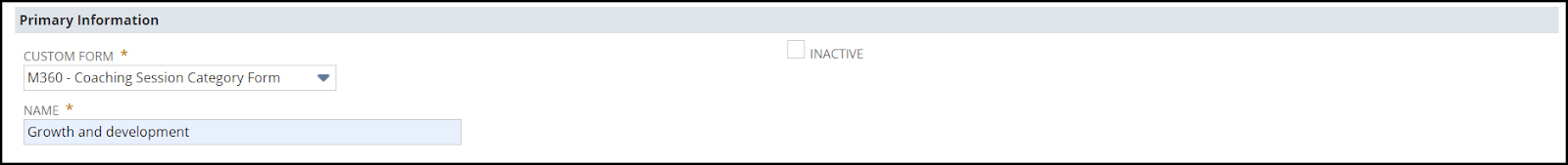 The Primary Information section within the Coaching Session Category form allows you to configure the essential details applicable to all coaching sessions under this category.