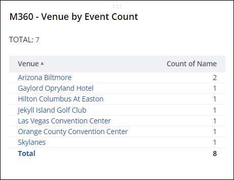 The M360 - Venue by Event Count widget displays the total number of venues added to the system. It also shows the name with the link and the number of events at each venue.