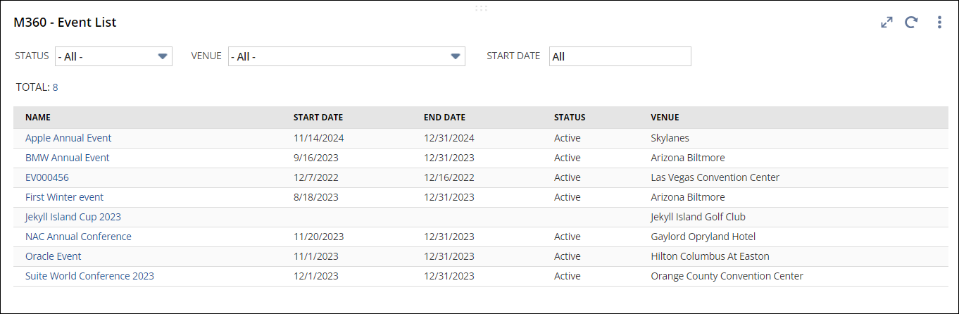 The M360 - Event List widget displays the names of the various events added to the system and their details, such as start and end dates, status, and venue.