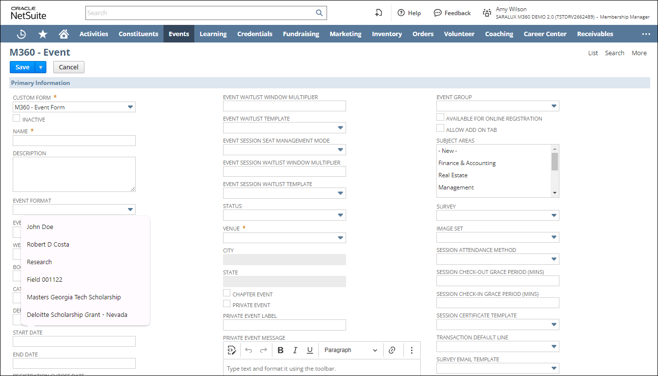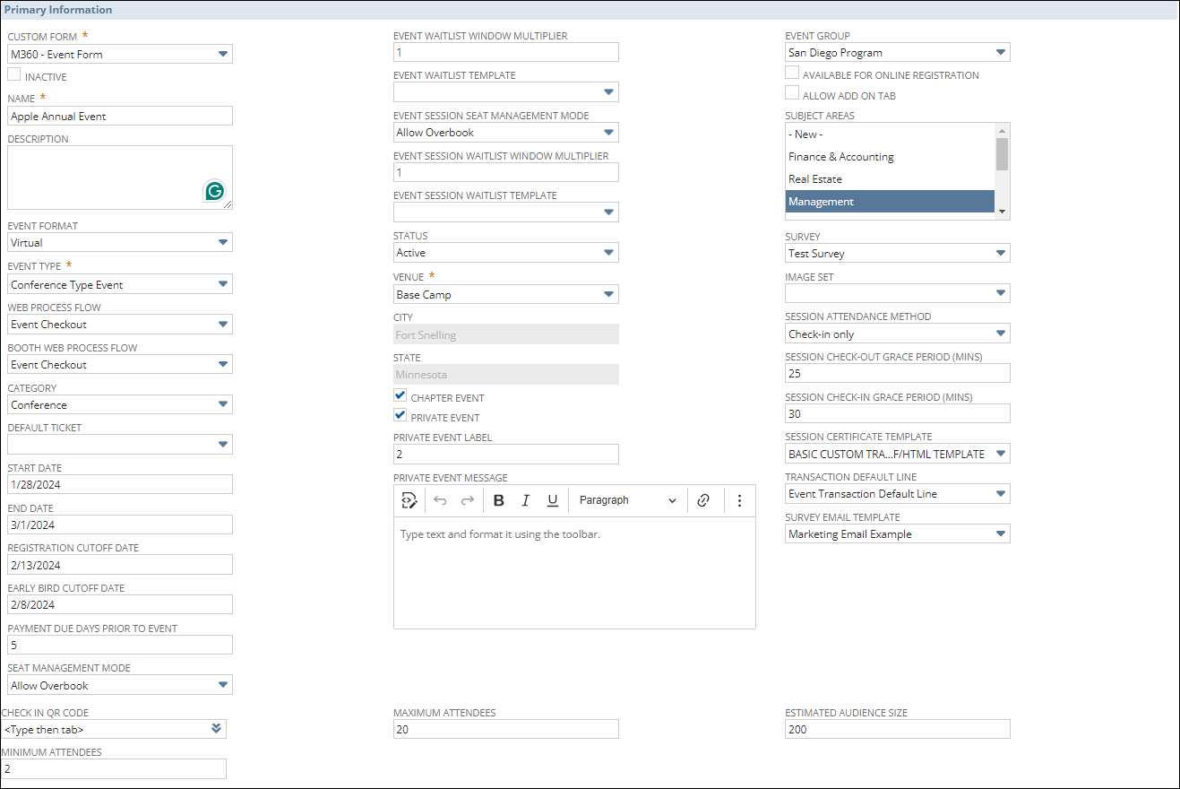 The Primary Information section within the Event form allows you to set the values in the associated fields that are essential.