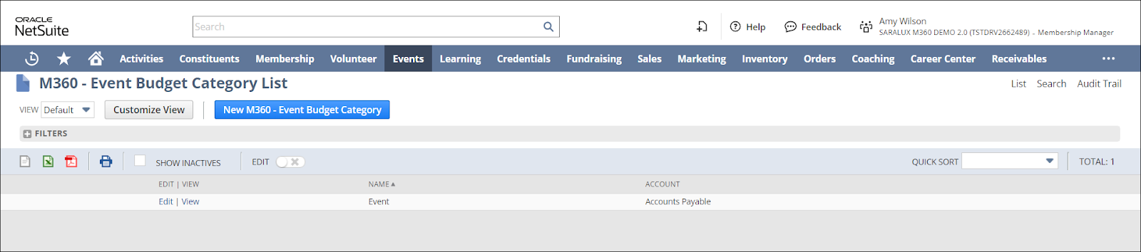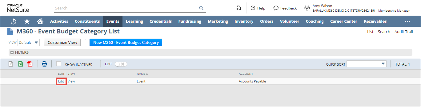 To edit an event budget category, navigate to the M360 - Event Budget Category List page and click Edit in the row of the event budget category you wish to modify,