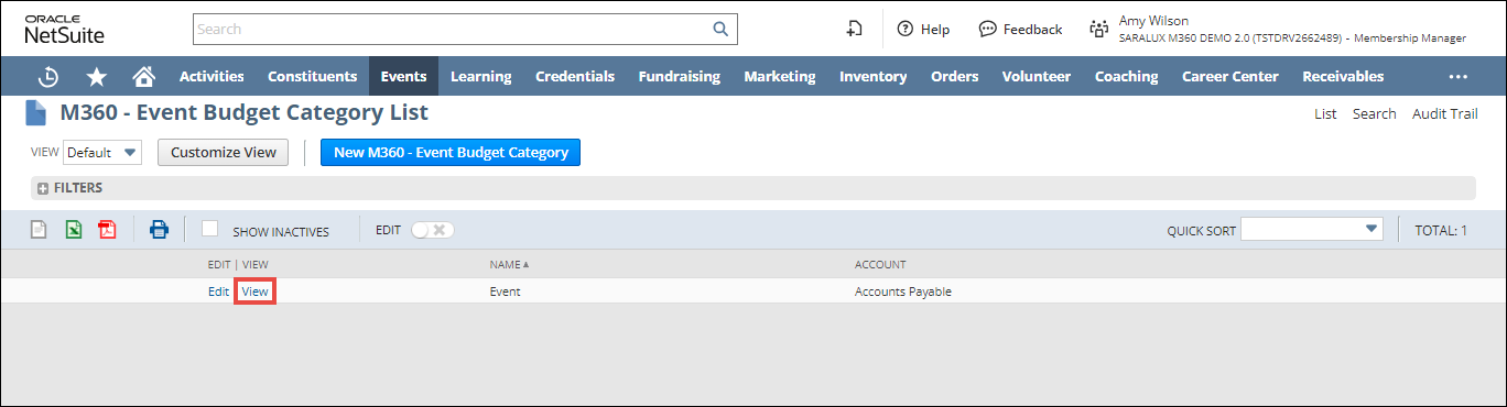 To view the details of an event budget category, navigate to the M360 - Event Budget Category List page and click View in the row of the event budget category you wish to view in detail.