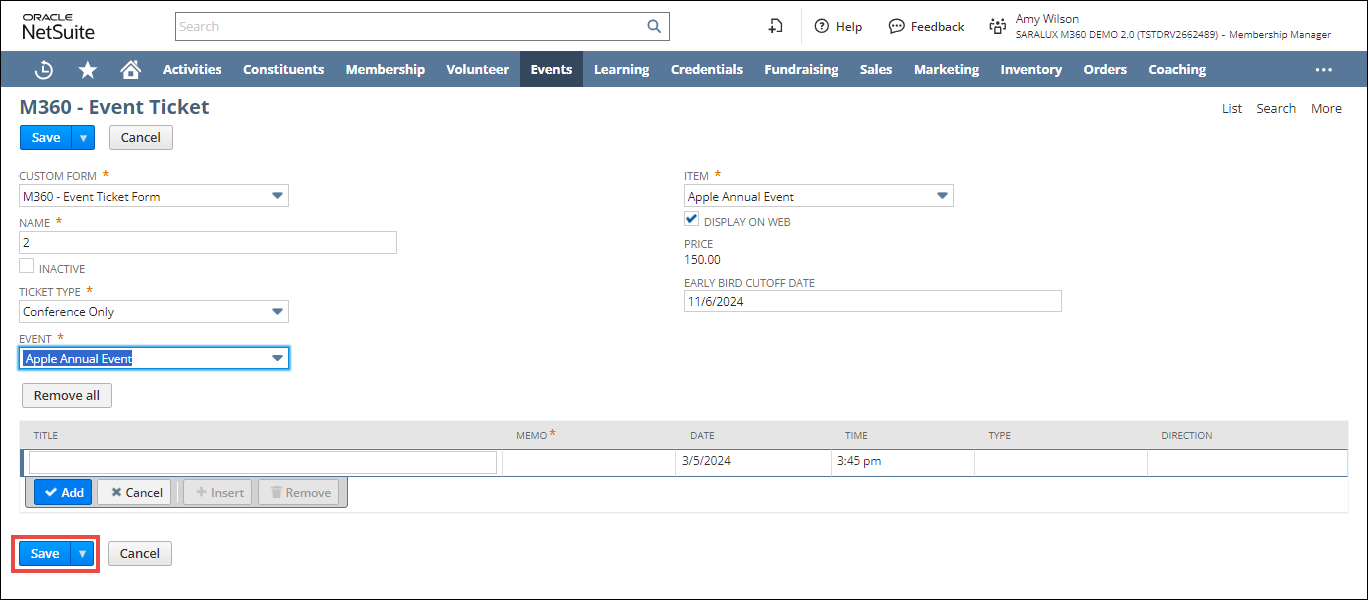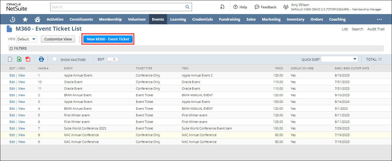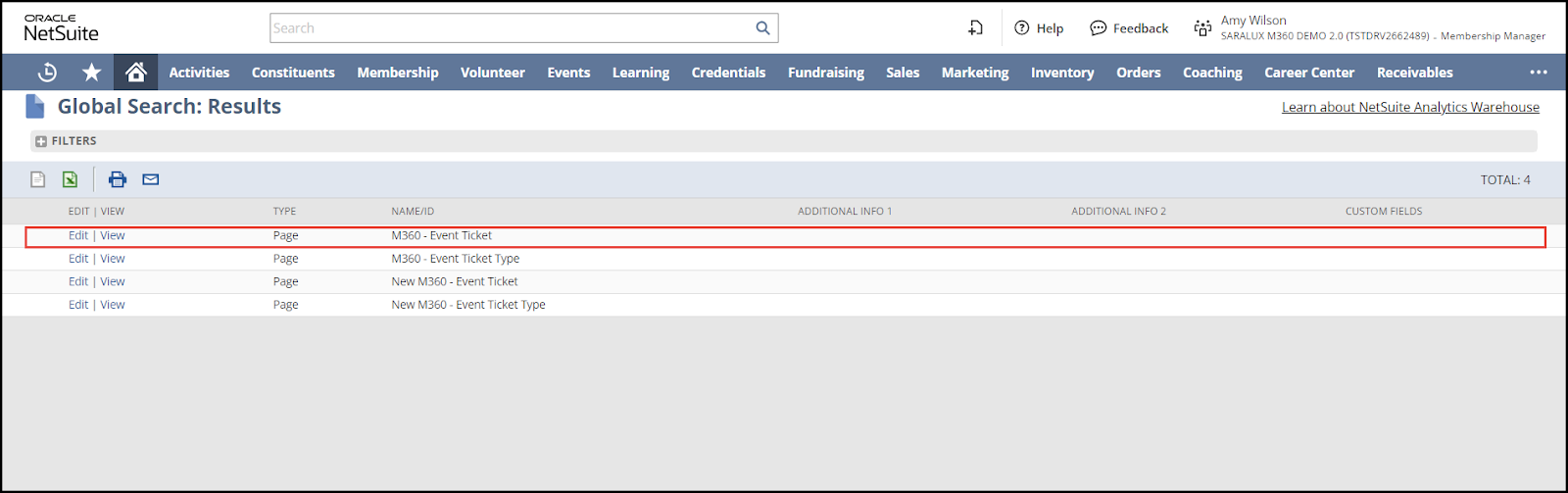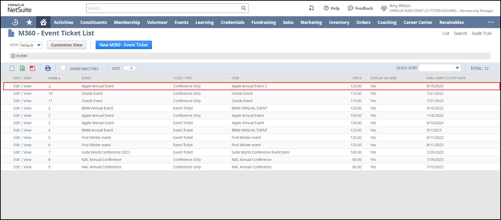 2.  Click anywhere in the row of M360 - Event Ticket.