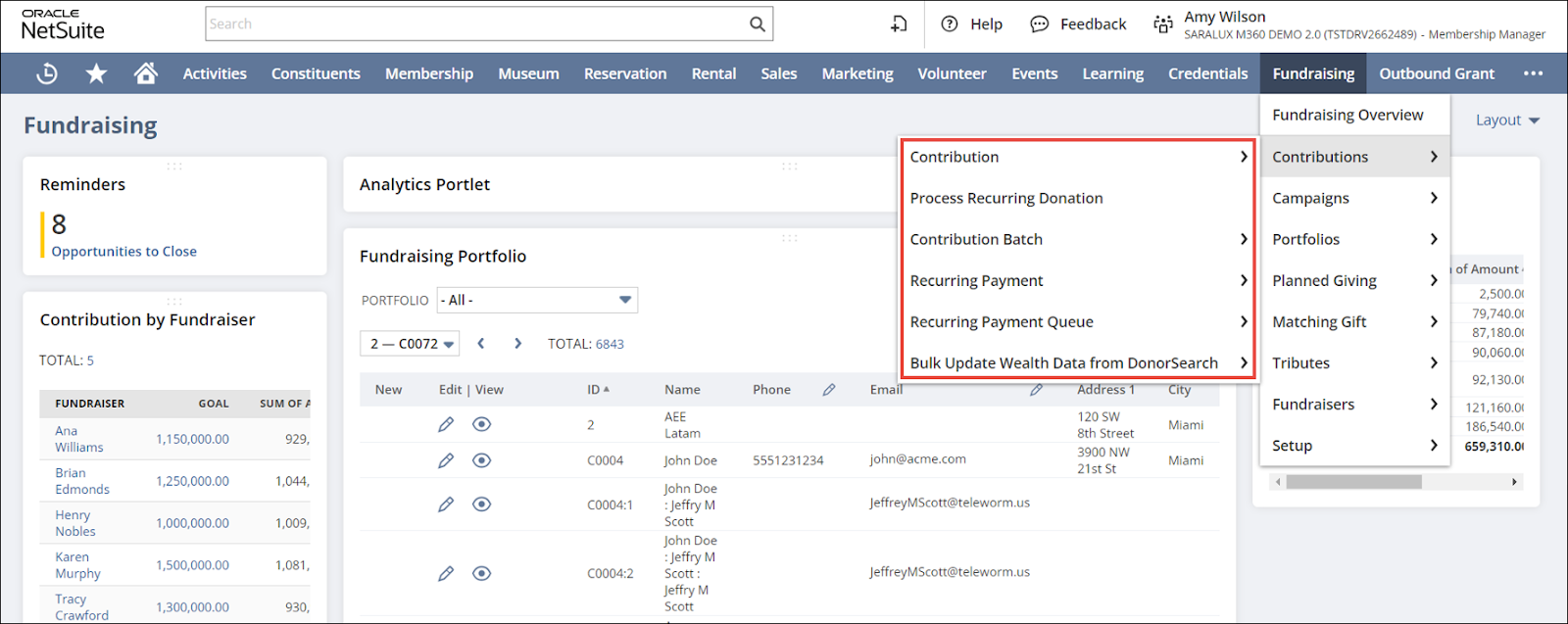 The Contributions section allows you to configure, track, and manage donation details like donation type, amount, and associated fundraising campaigns.