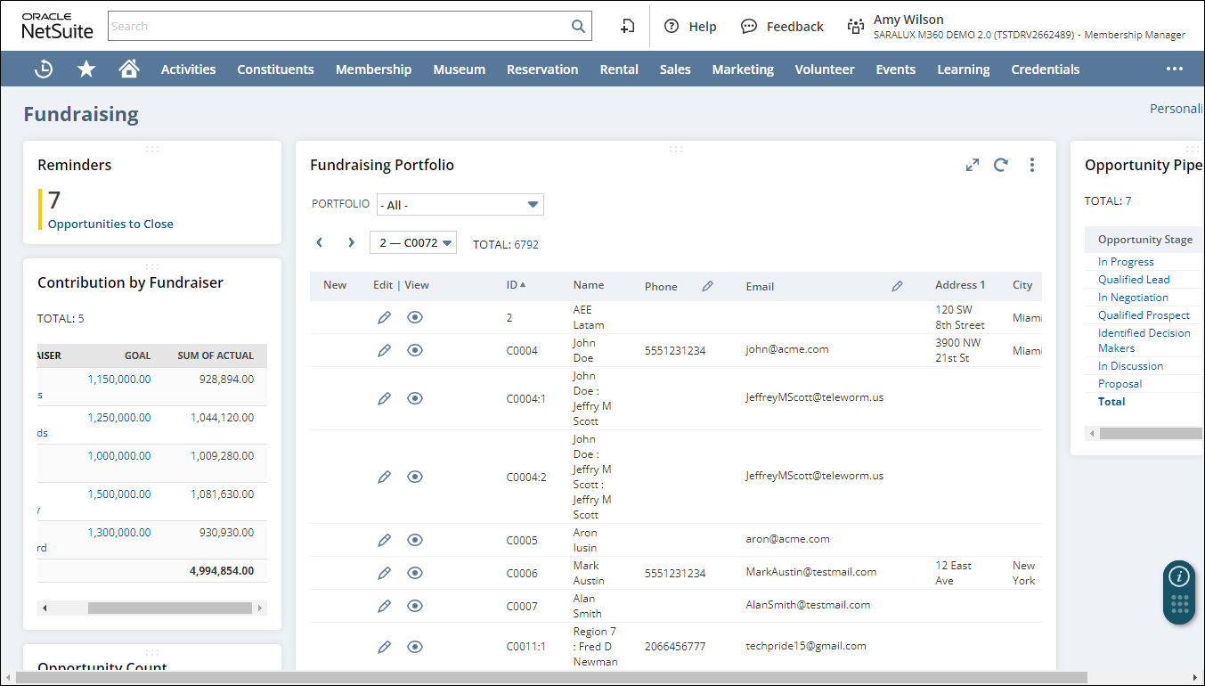 Reminders - This widget displays reminders related to the Fundraising module, such as Opportunities to close.