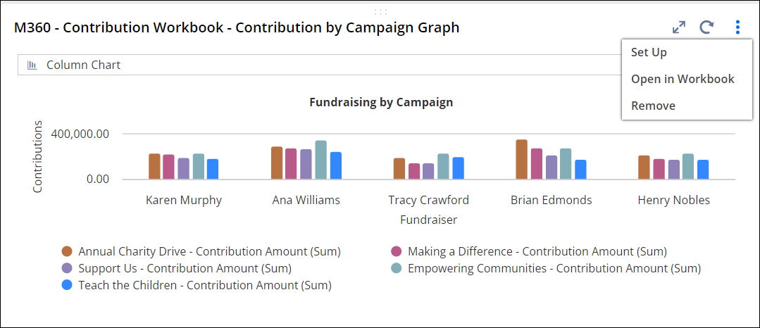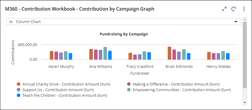 M360 - Contribution Workbook - Contribution by Campaign Graph - This widget displays a bar graph representing the total number of contribution workbooks categorized into various campaigns.