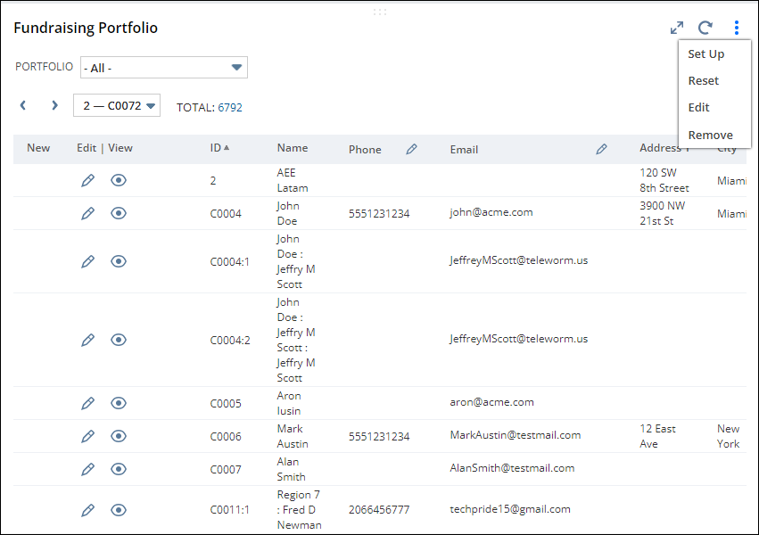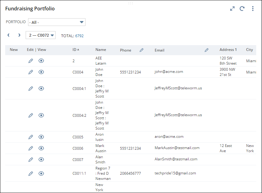 Fundraising Portfolio - This widget displays a tabular representation of fundraising assignments managed by fundraisers and their respective details within the selected portfolio.