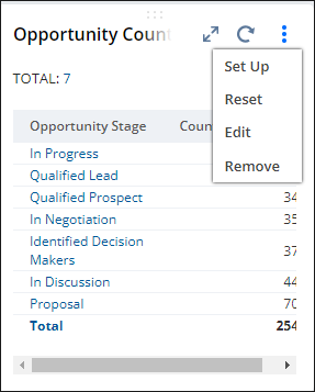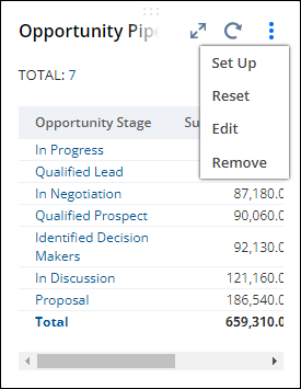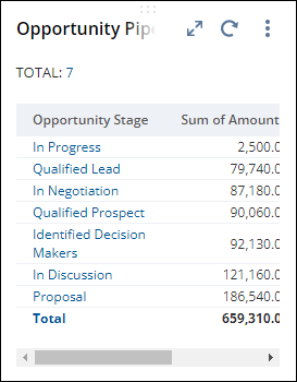 Opportunity Pipeline - This widget displays a table listing the various opportunity stages and the total amount associated with that stage.