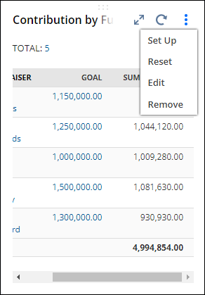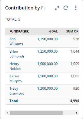 Note: Upon hovering the mouse over the widget, similar to those available on the Contribution by Fundraiser widget. For more information, please refer to Contribution by Fundraiser.