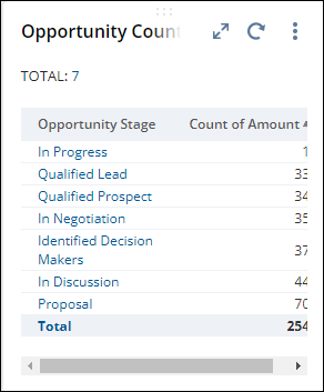 Opportunity Count - This widget displays the number of opportunities across various stages like In Progress, Qualified Lead, Proposal, etc.