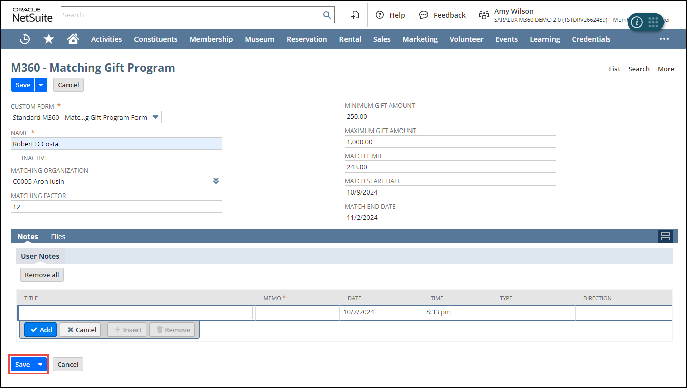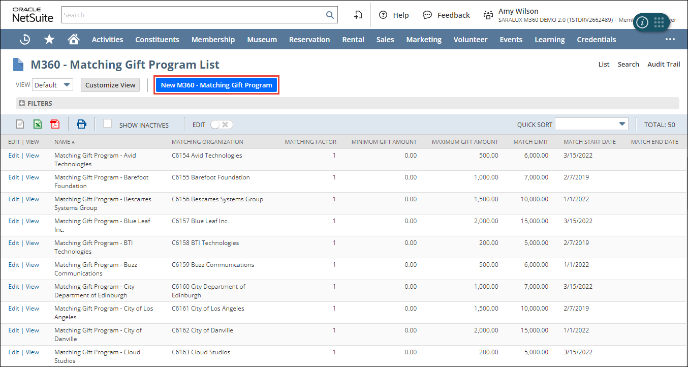 1. On the Matching Gift Program List page, click New M360 - Matching Gift Program.