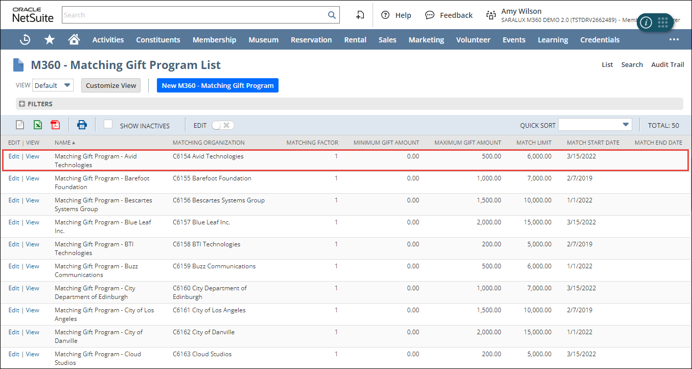Note: You can update or view the matching gift details by clicking Edit/ View in the desired row.