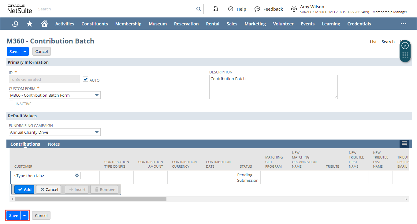 The M360 - Contribution Batch form is displayed.
