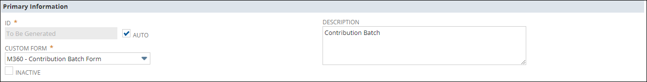 The Primary Information section within the Contributions Batch form allows the setting up of essential details regarding the contribution batch.