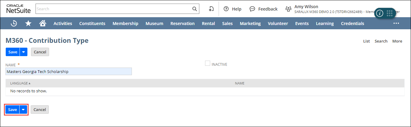 4. Check the INACTIVE checkbox to deactivate this contribution type.