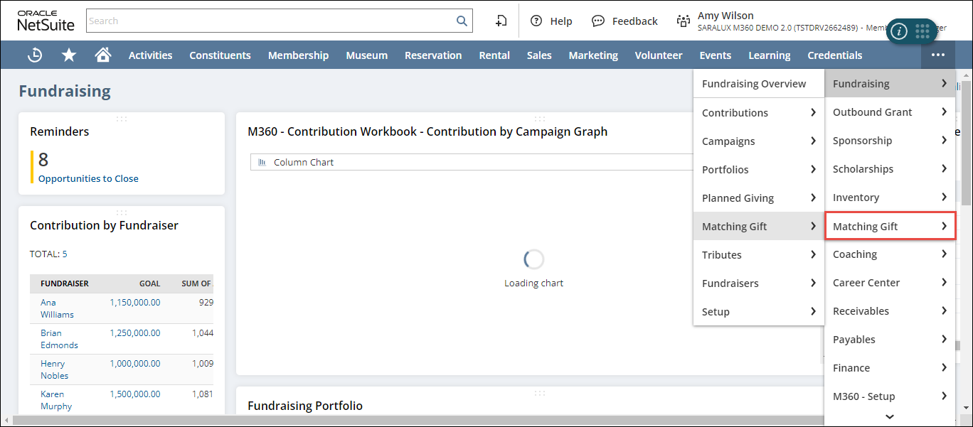 The Matching Gift section in the Fundraising module allows you to configure programs for companies to match donations made by their employees to encourage larger donations, effectively increasing the impact of original donor gifts.