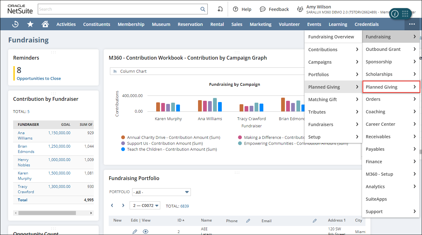The Planned Giving section allows you to configure and manage future contributions, ensuring donor intentions are honored.