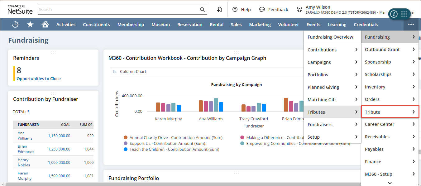 Tributes The Tributes section within the Fundraising module lets you to capture essential details for managing a tribute donation. 1. Navigate to Fundraising > Tributes > and click Tribute. The Tribute List page is displayed.
