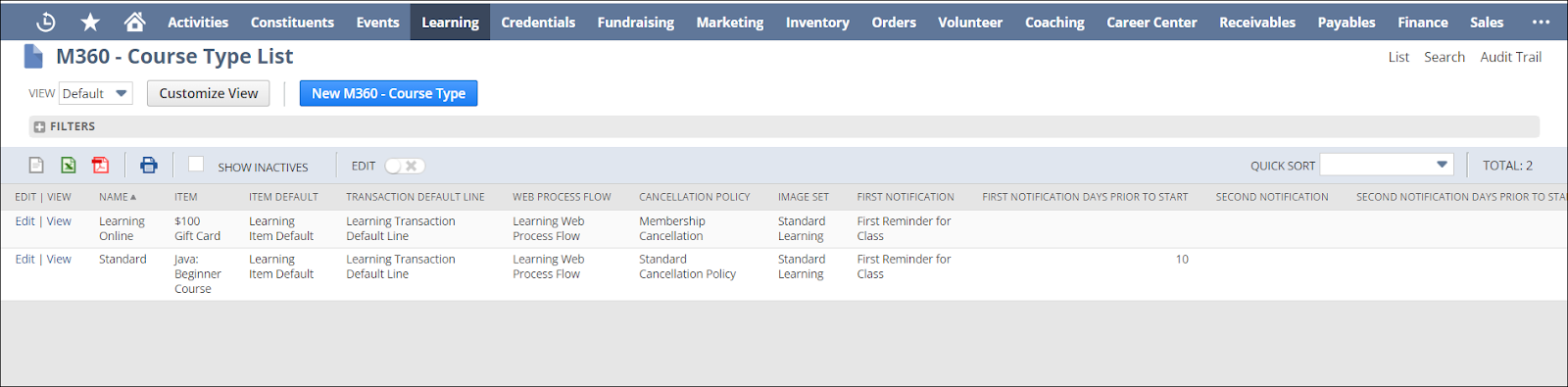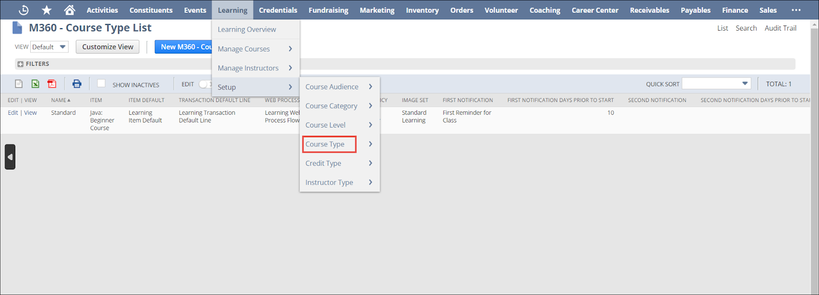 1. Navigate to Learning > Setup > and click Course Type.