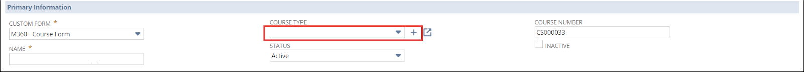 Note: Alternatively, you can create a Course Type by navigating to the Course form > Primary Information and clicking New from the COURSE TYPE dropdown list or the corresponding