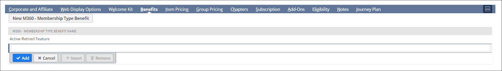 Enter the benefit you wish to include in this membership type in the M360-MEMBERSHIP TYPE BENEFIT NAME field and press Add.
