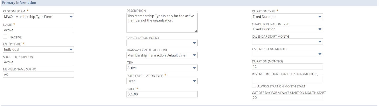 In the Primary Information section of the Membership Type form, important data required for the creation of a membership type has to be entered or selected in the associated fields.