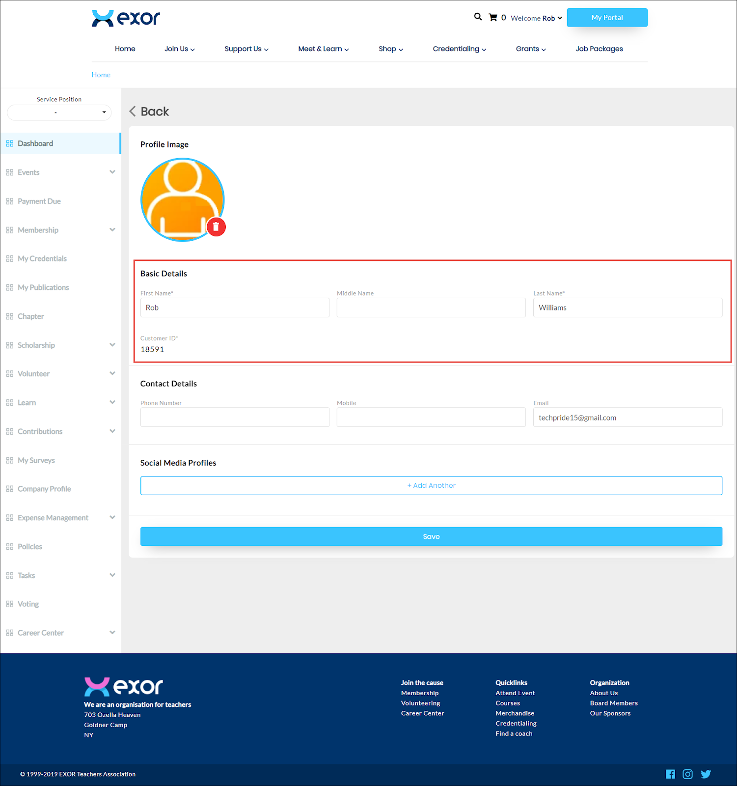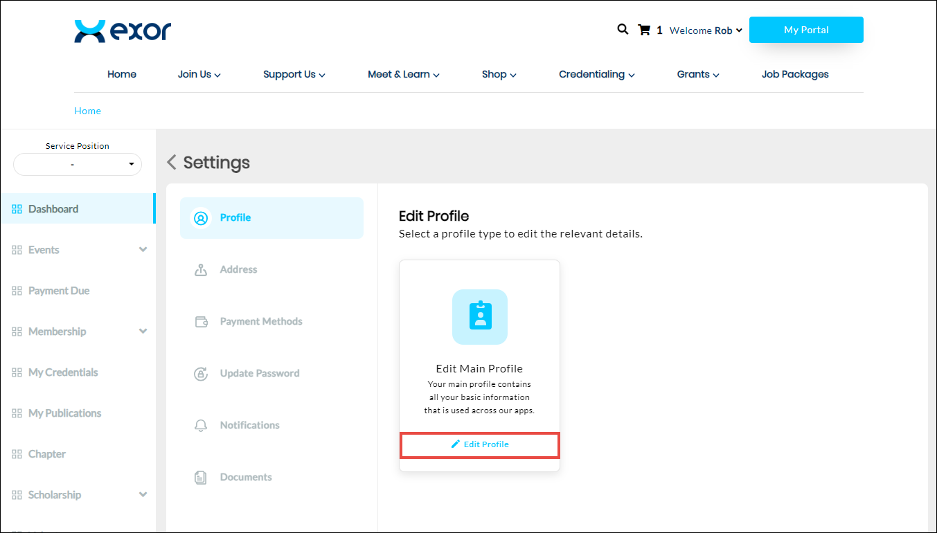 1.  Navigate to My Portal Dashboard > Profile widget > Settings > click Edit Main Profile.