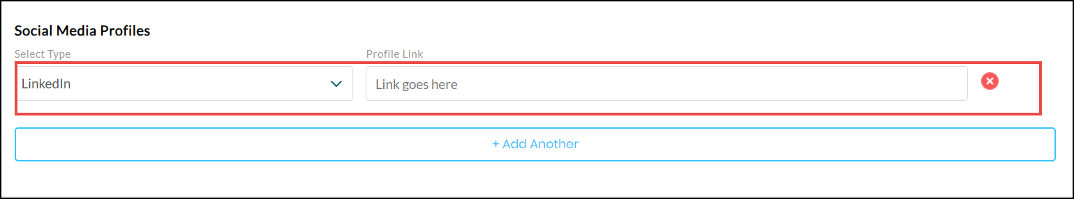 Note:  You can add more social media profile details by clicking Add Another, or remove the social media profile that you no longer need by clicking the Delete icon associated with the social media profile.