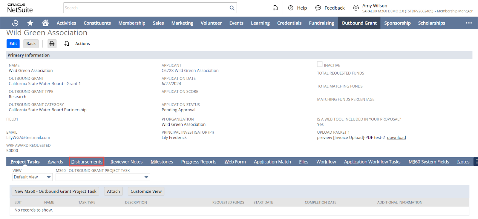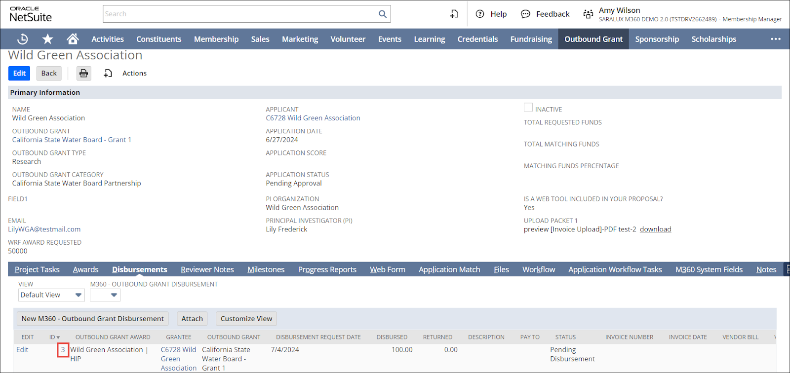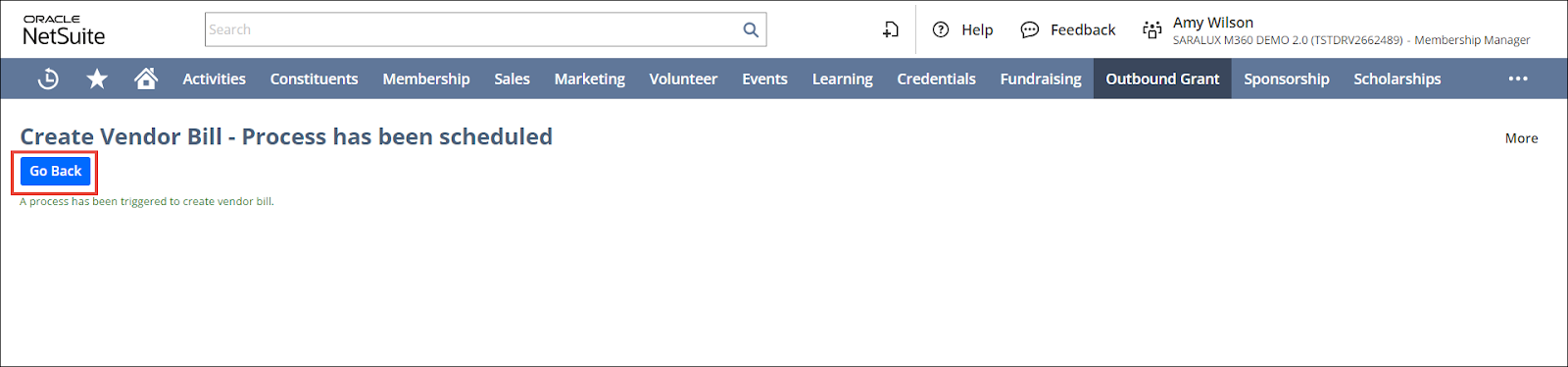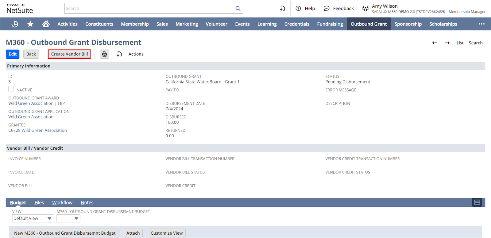 You can create a vendor bill for an outbound grant application with a status of Pending Disbursement by following the steps below.