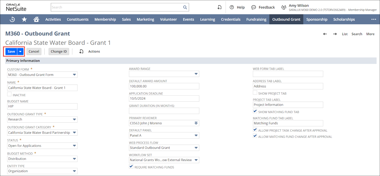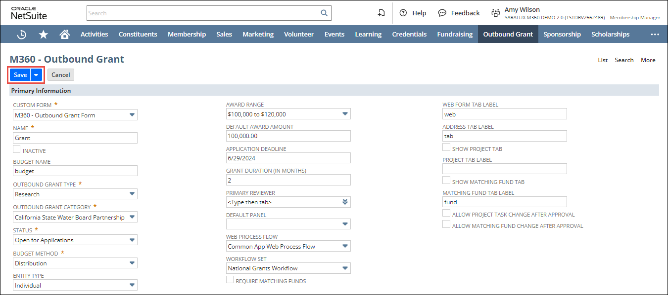 The Primary Information section allows the setting up of essential fields associated with the outbound grant.
