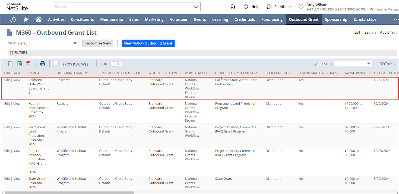 You can click Edit in the row of the outbound grant to update it and click View to review the outbound grant data.