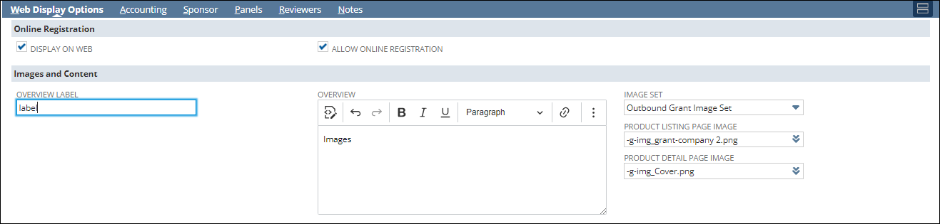 The Web Display Options section within the Outbound Grant form allows you to configure the appearance of the outbound grant fields on the website.