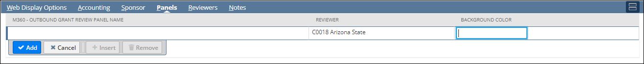 The Panels section within the outbound grant form allows you to set up the review panel associated with the grant.