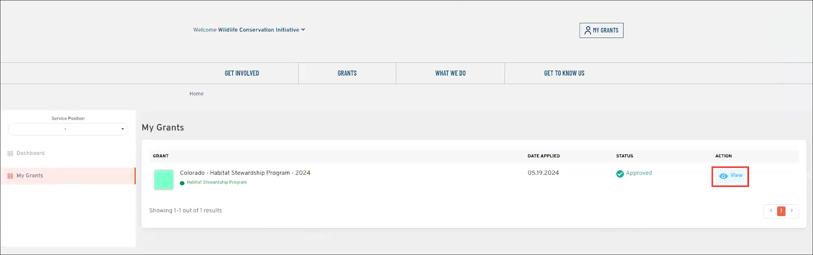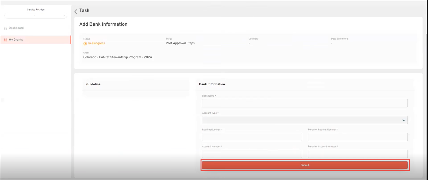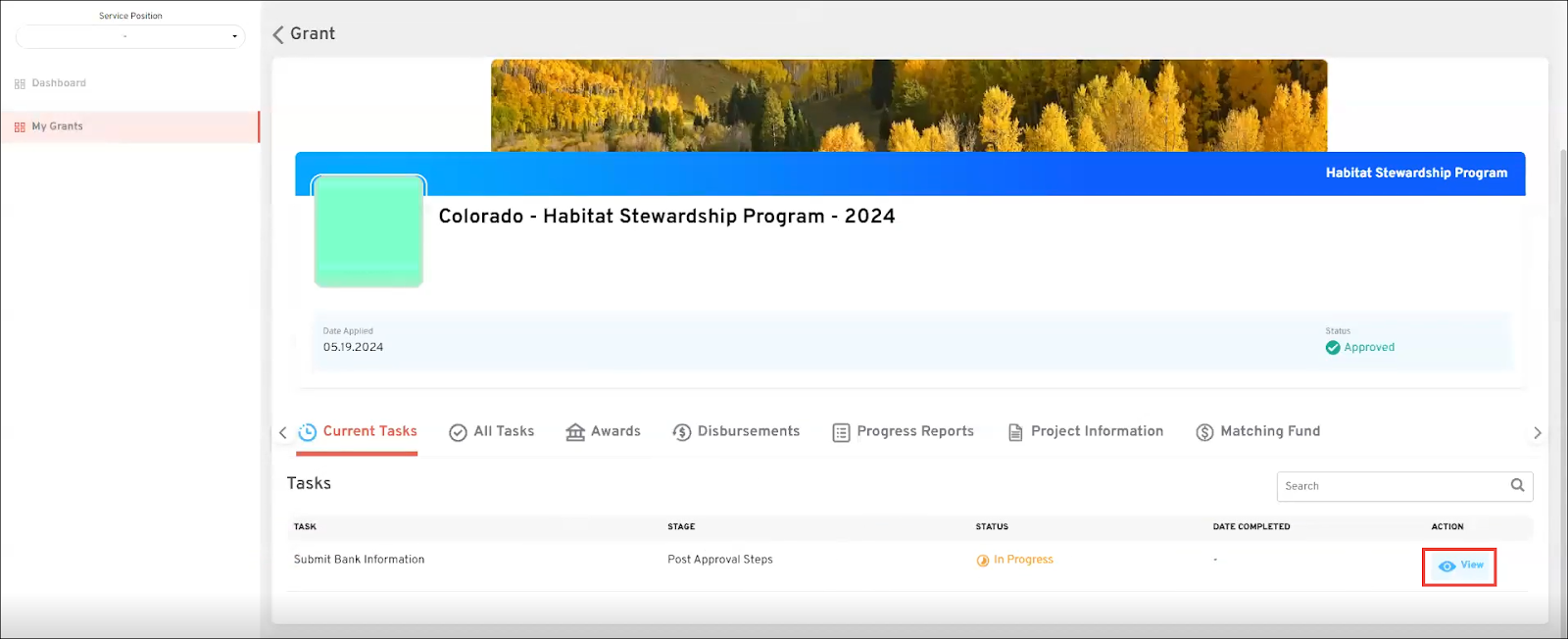 4. Click View in the row of the Outbound Grant under Current Tasks to update the bank information.