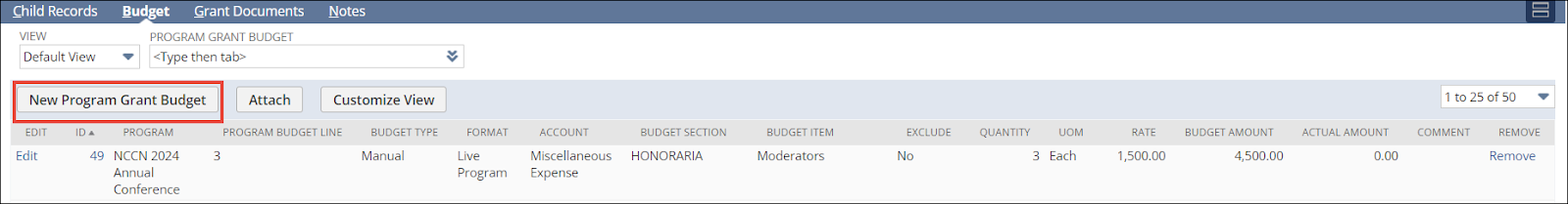 You can review the summary of the program grant budget including the program grant budget ID, budget line, account, budget type, budget section, budget item, and more.