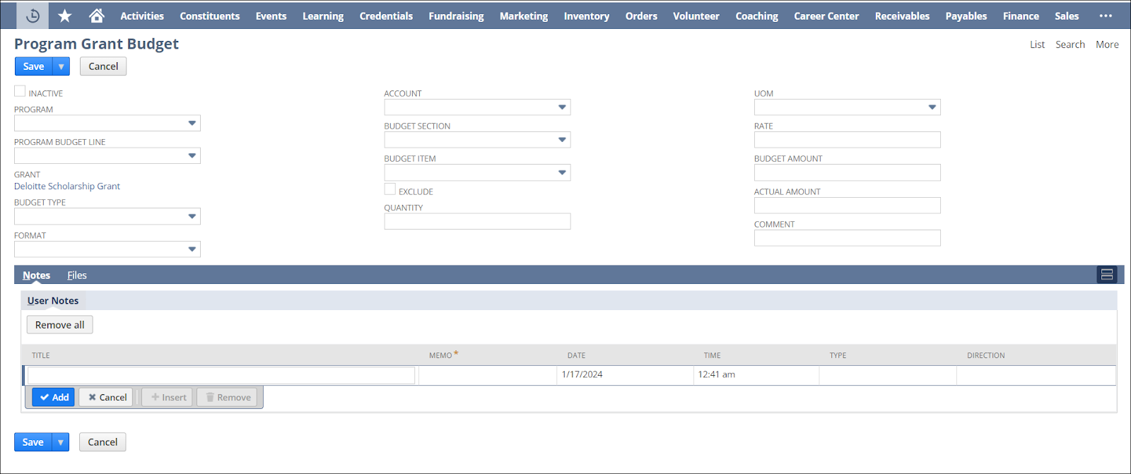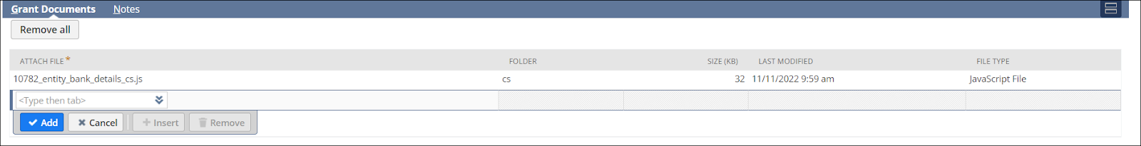 The Grant Documents section within the Grant form allows you to attach any document related to the grant.