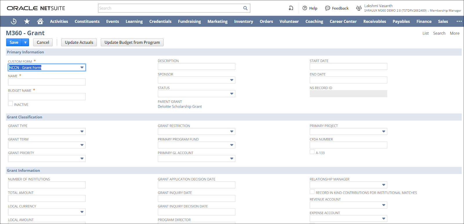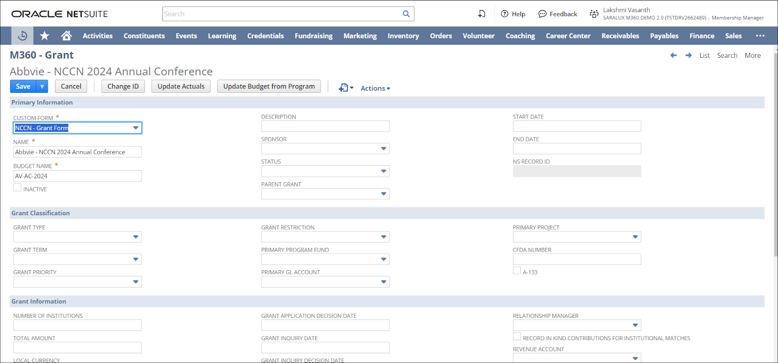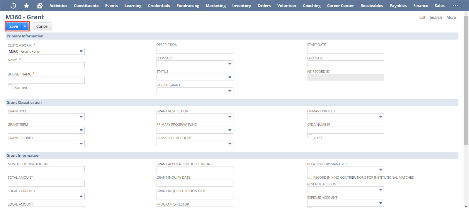 5. Make the necessary changes to the respective fields and click Save. In addition to Primary Information, Grant Classification, and Grant Information, please refer to the following sections: