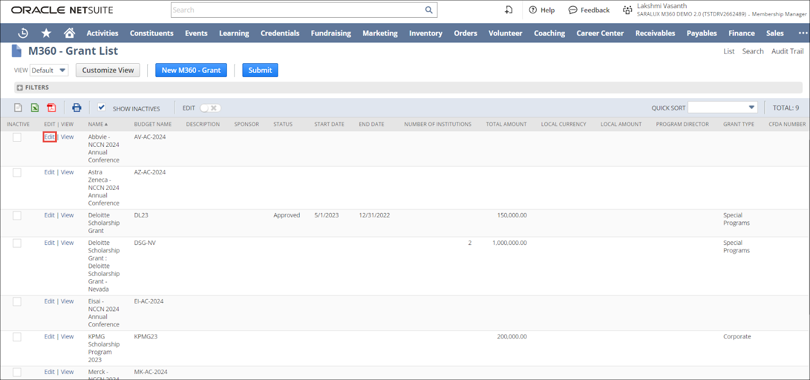 To modify grant details, click Edit in the row of the desired grant within the Grant List page.