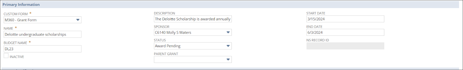 The Primary Information section within the Grant form allows you to enter/ select the essential details regarding the scholarship grant available in the associated fields.