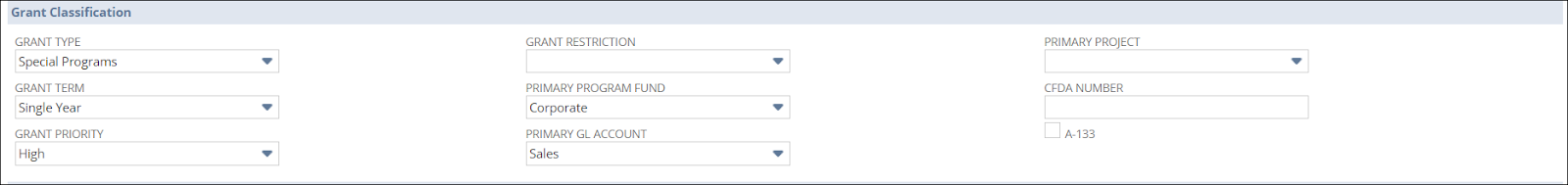 The Grant Classification section on the Grant form enables you to categorize the grant systematically based on type, term, priority, restriction, primary project, and primary program fund.