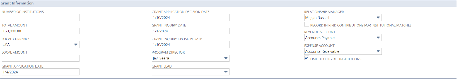 The Grant Information section within the Grant form enables you to specify the essential details such as the number of institutions involved, the total grant amount allocated, and the local currency used. Additionally, important information in the grant cycle such as grant inquiry date, grant decision date, grant inquiry decision date, program director, and revenue account can also be entered.