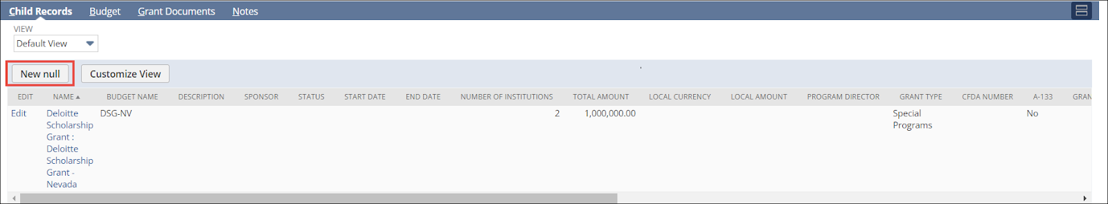 You can review the summary of the child record information such as the Primary Grant, total amount granted to the child record, start and end dates of the child grant, etc.