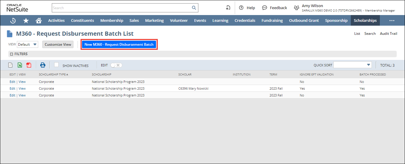 1.  On the M360 - Request Disbursement Batch List page, click New M360 - Request Disbursement Batch.