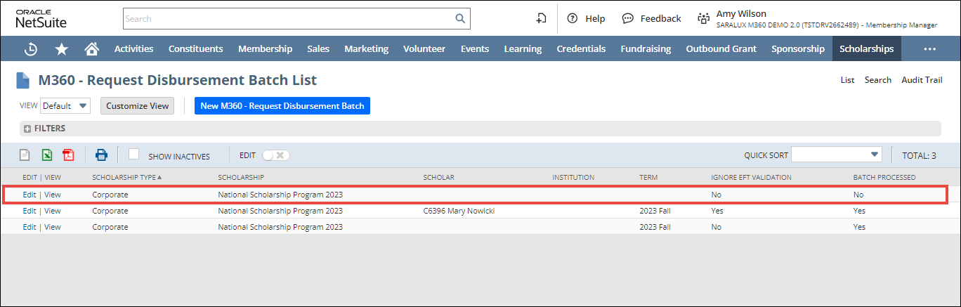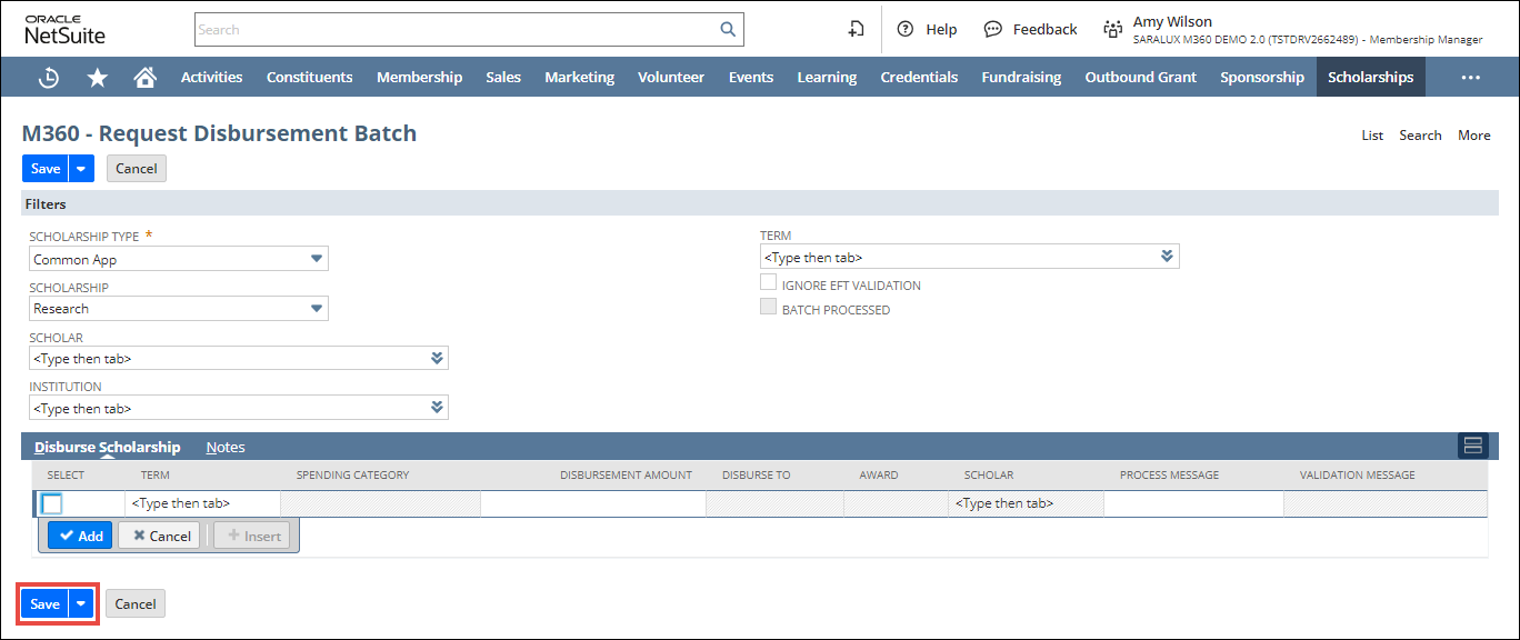 You can create a request disbursement batch to manage the scholarship allocations.