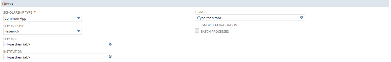 The Filters section within the Request Scholarship Disbursement form allows you to configure the criteria for disbursing the funds to the eligible candidates.