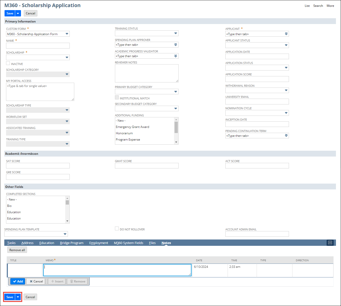 1.  On the M360 - Scholarship Application List page, New M360 - Scholarship Application.